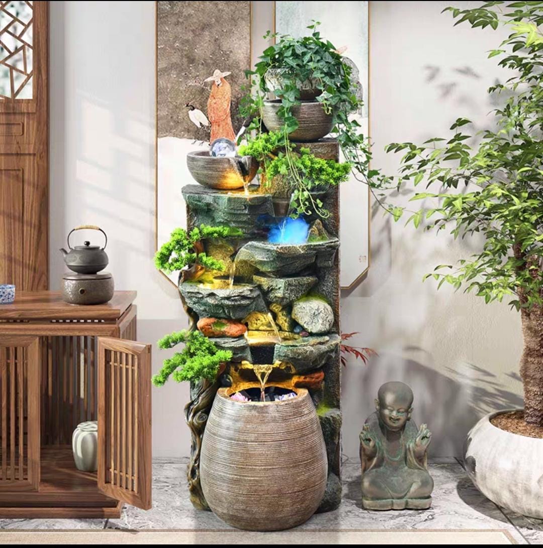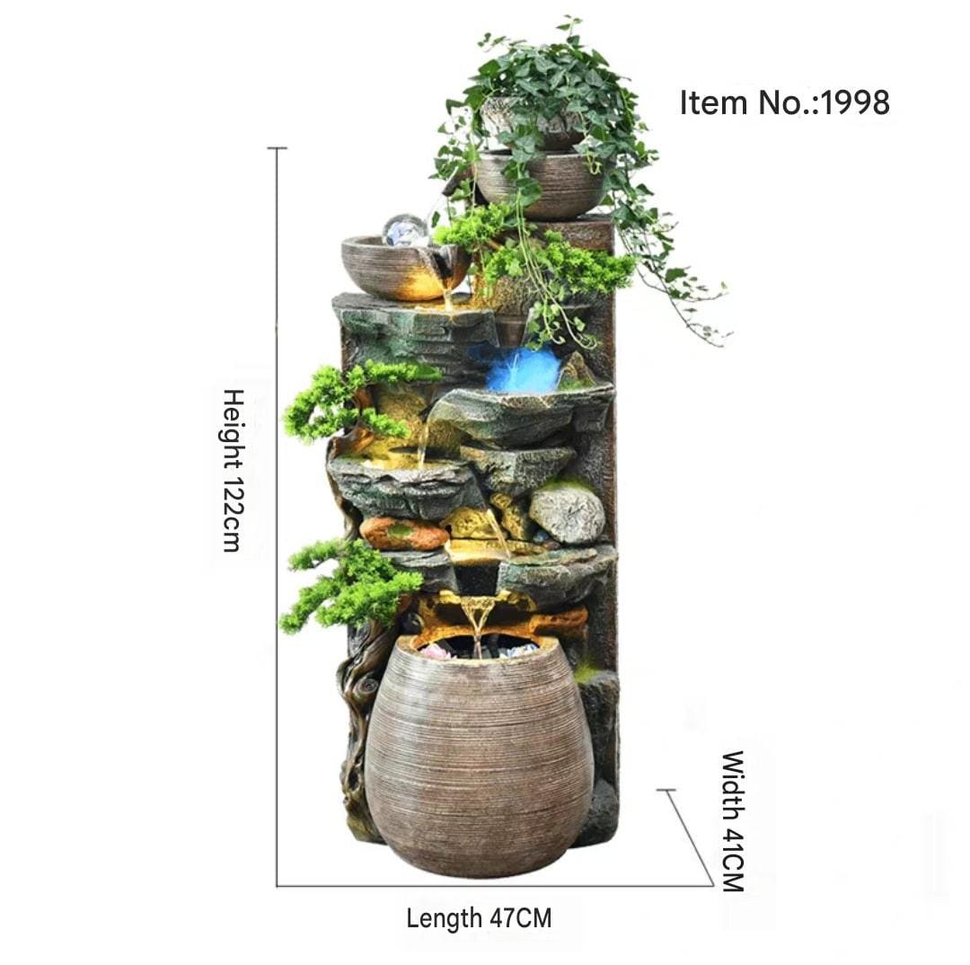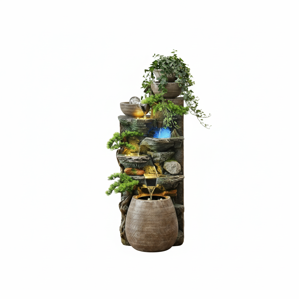 Features cascading water flow through multiple levels with decorative stone-look tiers and integrated planter spaces