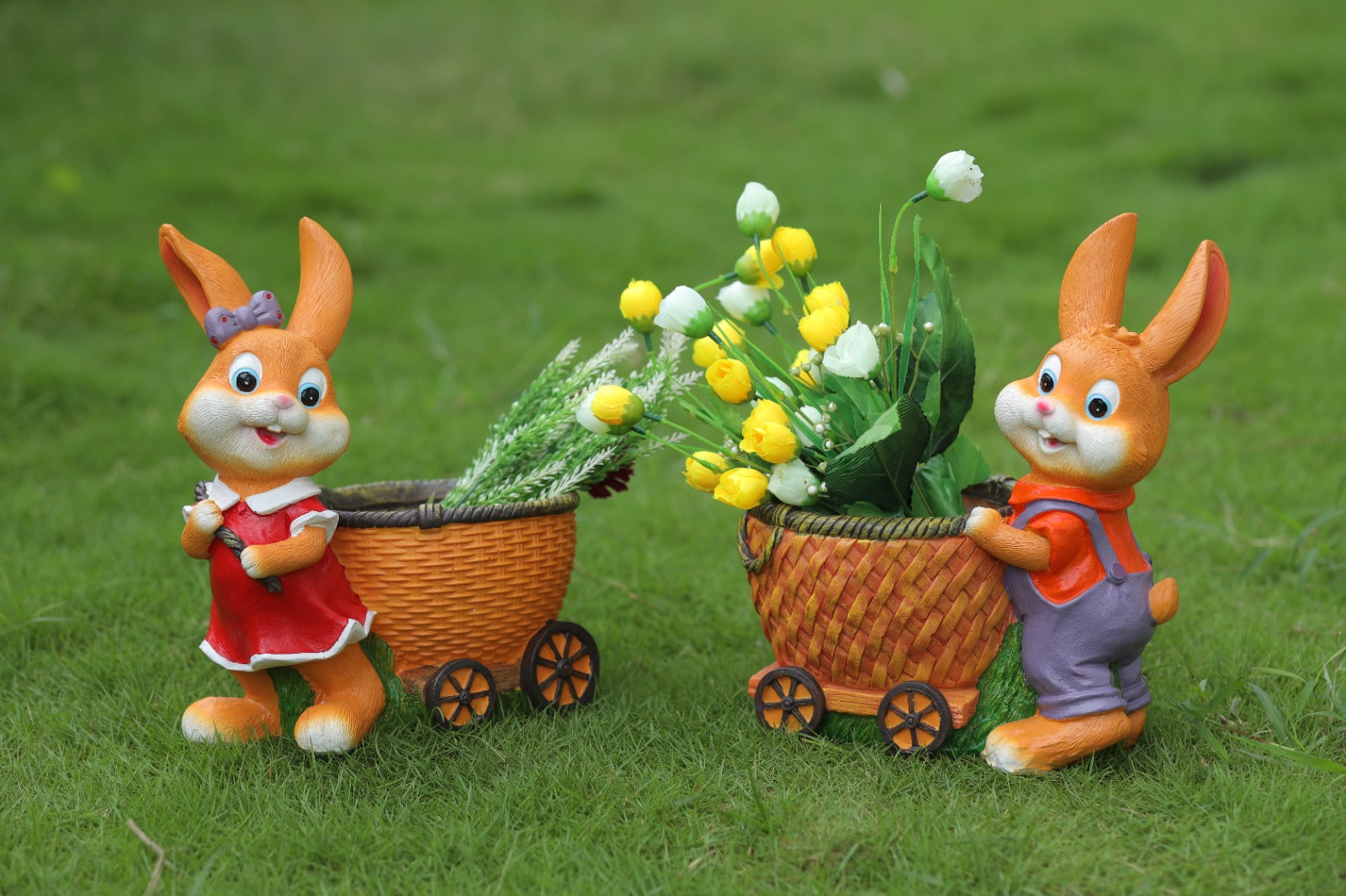 Charming pair of deer figurines featuring one in pink dress and one in green