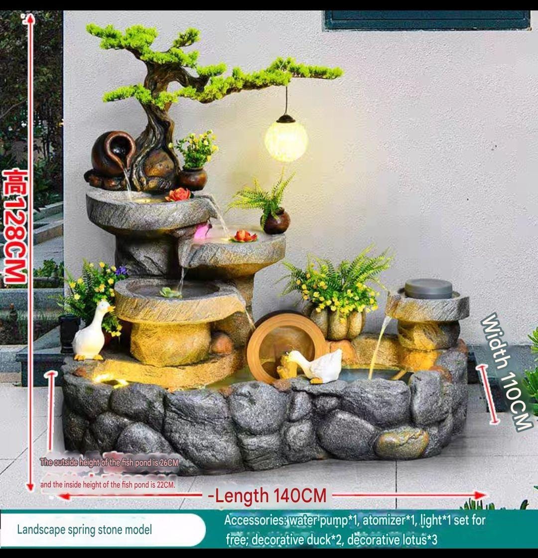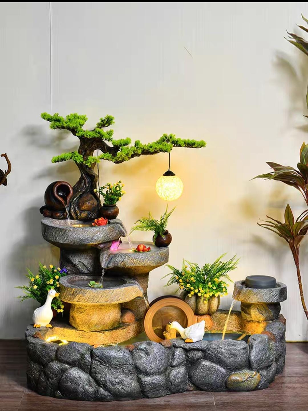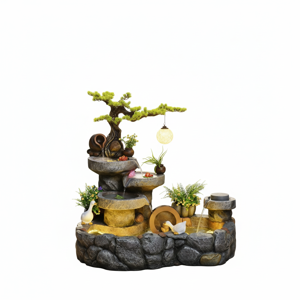 Three-tier cascading waterfall with realistic stone texture, adorned with an artistic bonsai tree and hanging LED light for ambiance