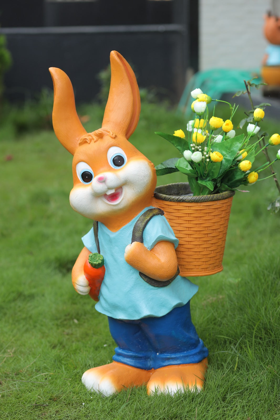 Charming garden bunny statue in vibrant orange and blue attire, holding a decorative woven basket adorned with delicate floral accents