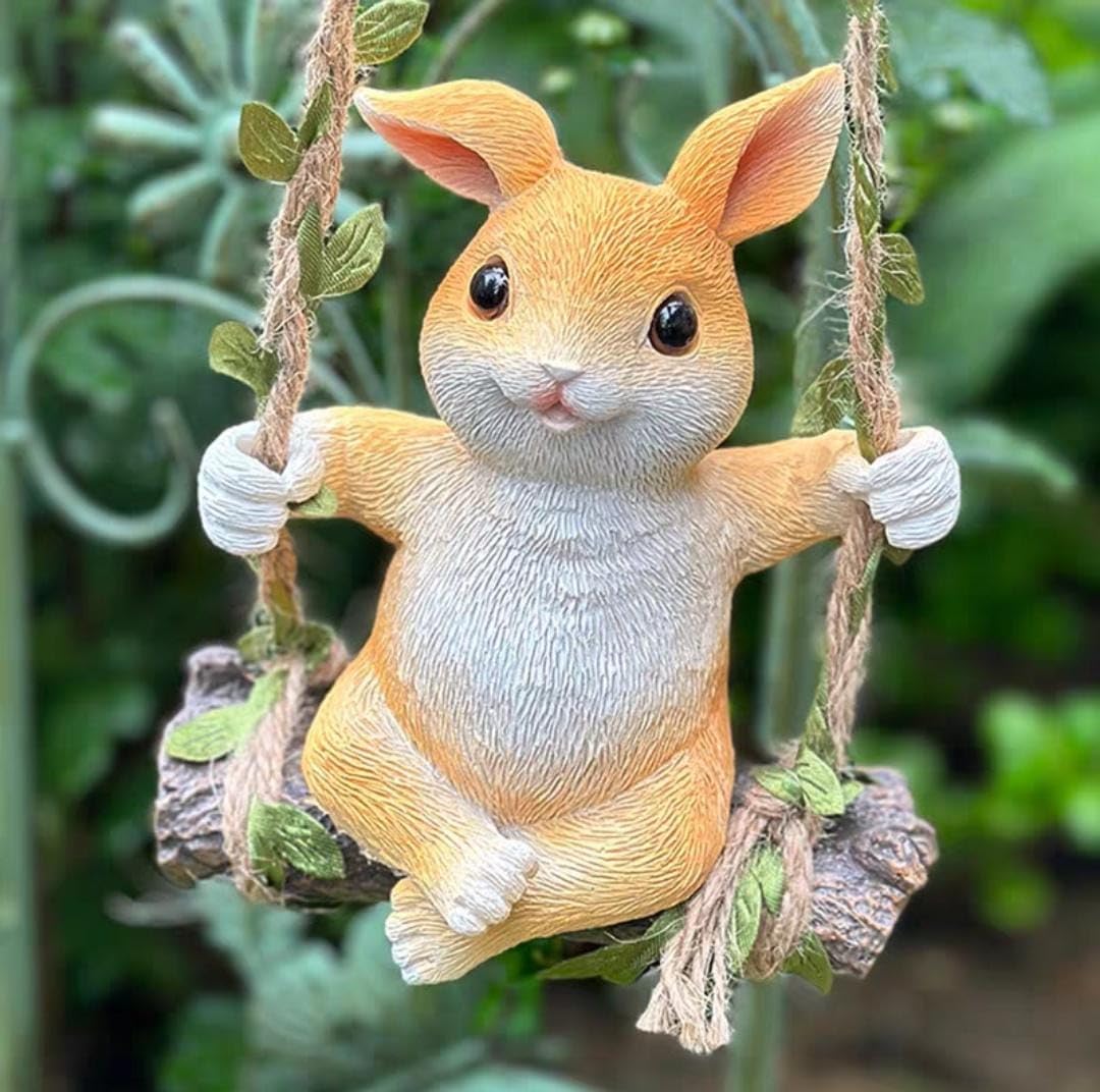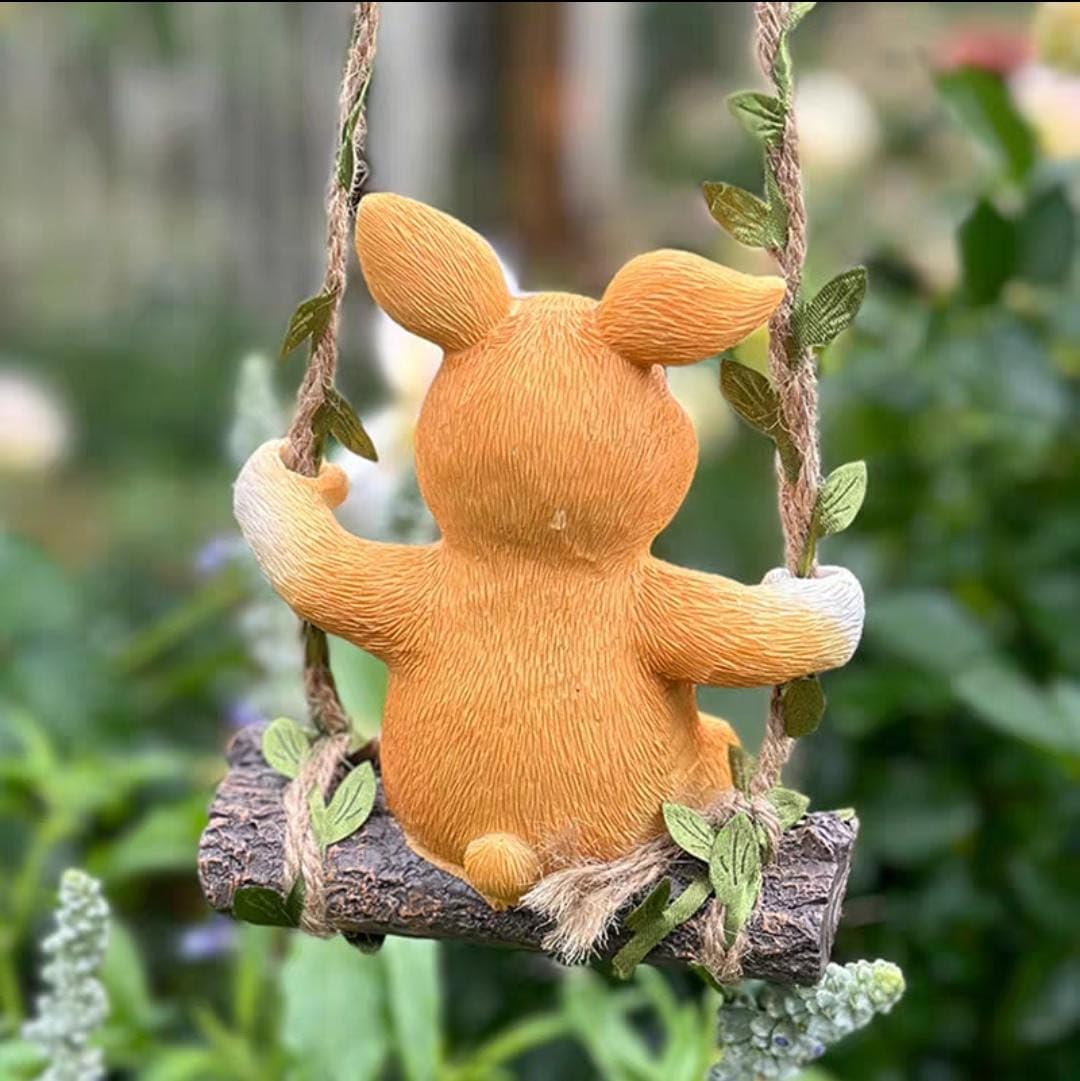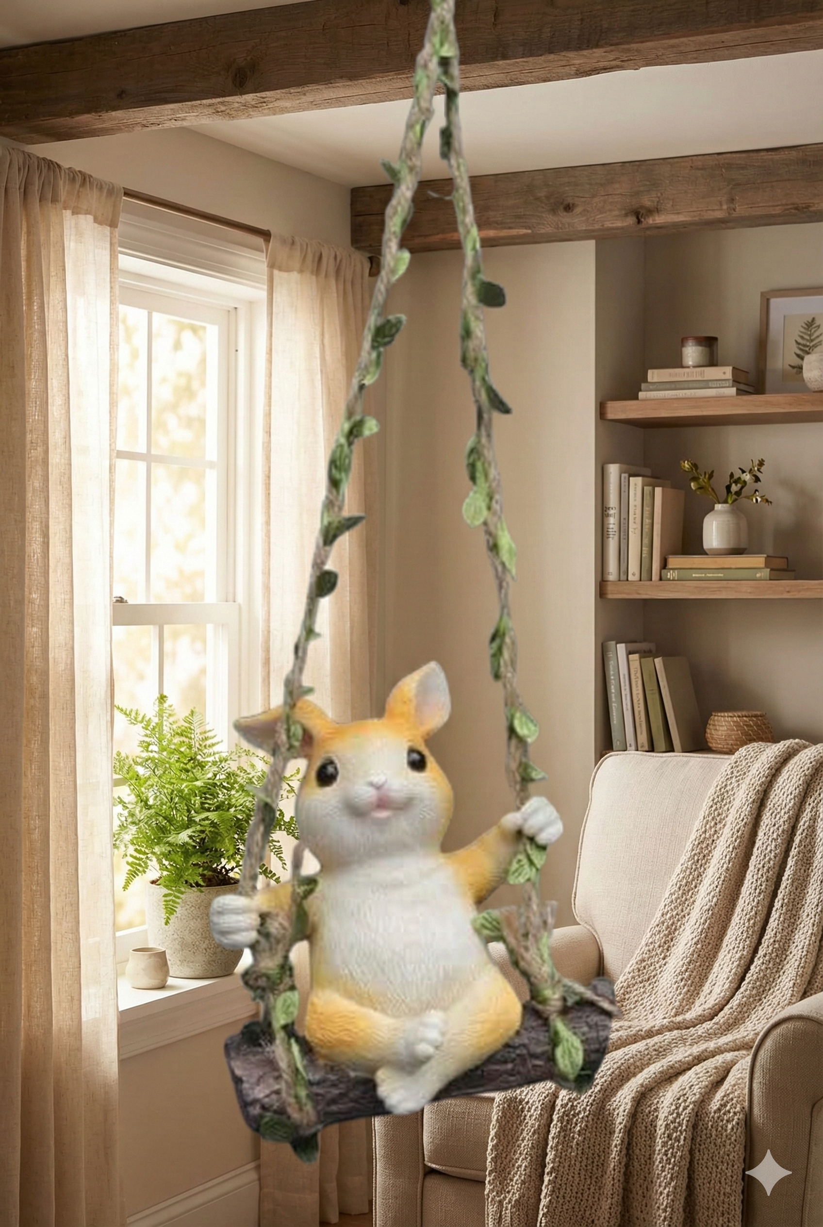 Adorable hamster figurine seated on a rustic leaf vine swing, crafted from durable resin with detailed white and orange coloring