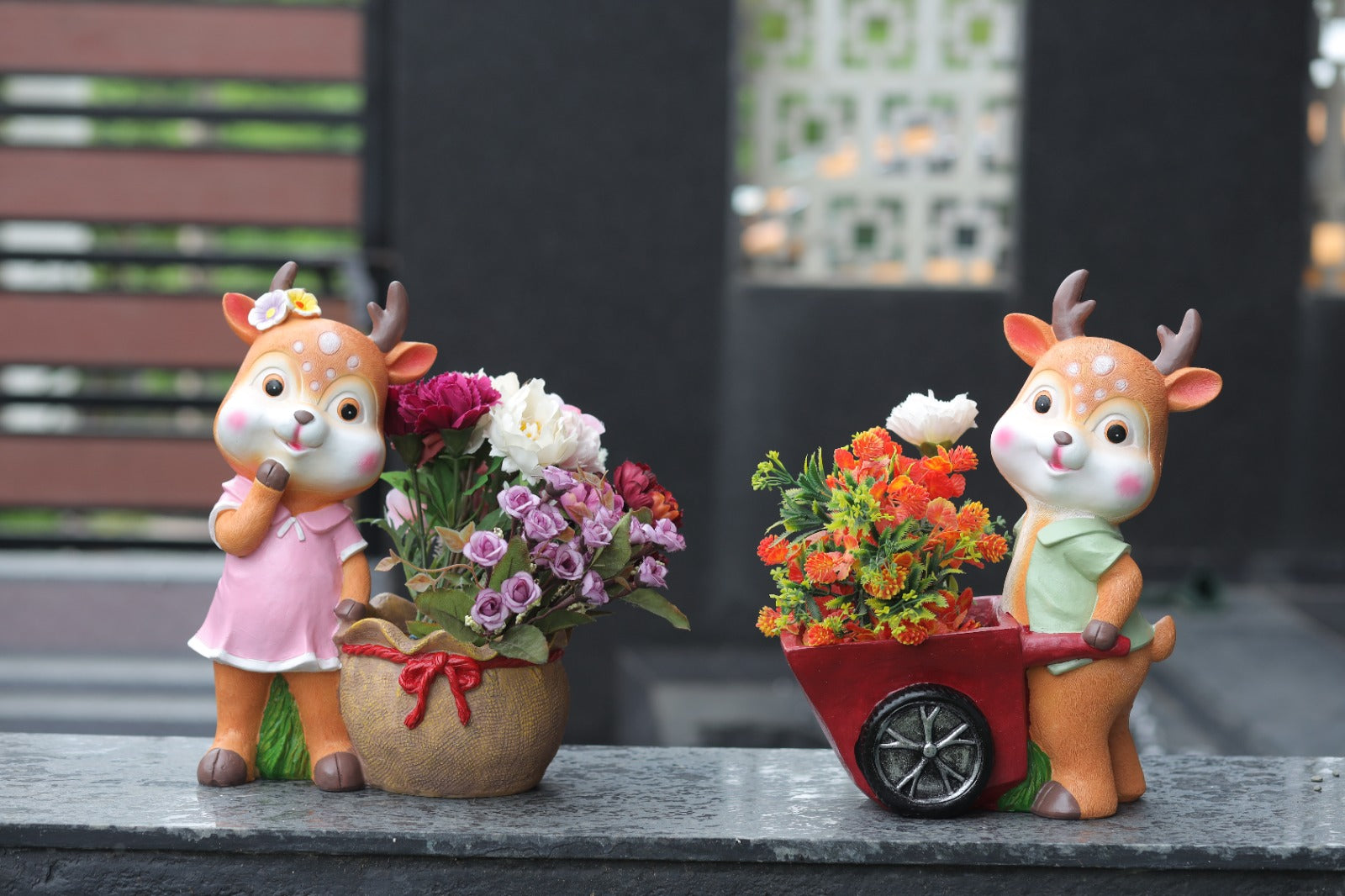 Charming pair of deer figurines featuring one in pink dress and one in green