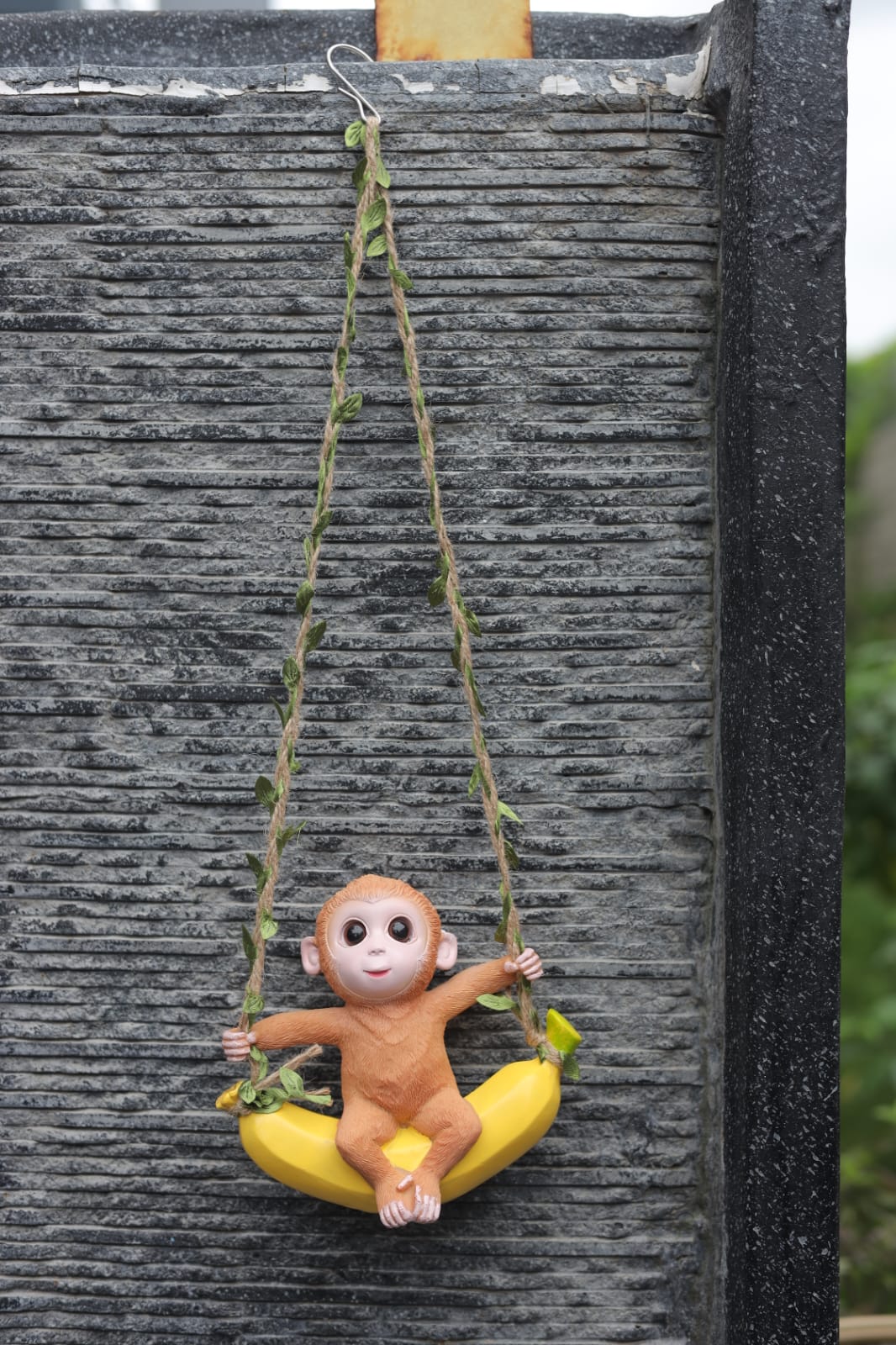 Charming monkey figurine swinging on a banana-shaped seat, adding a whimsical touch to your outdoor space