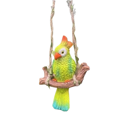 Beautifully crafted green parrot ornament with vibrant yellow-green plumage, orange crest, and blue tail feathers, perfect for adding tropical charm to your garden