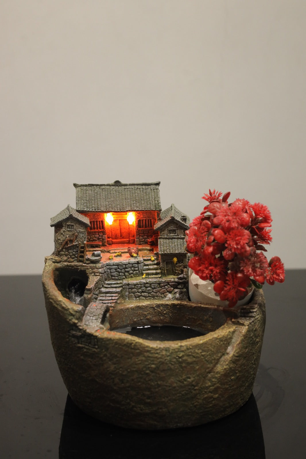 Features built-in LED lights that create a warm, atmospheric glow, highlighting the intricate details of the traditional Japanese pagoda architecture