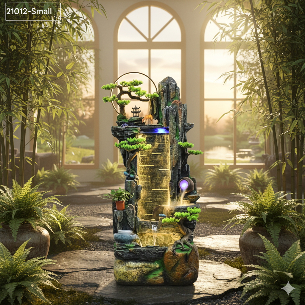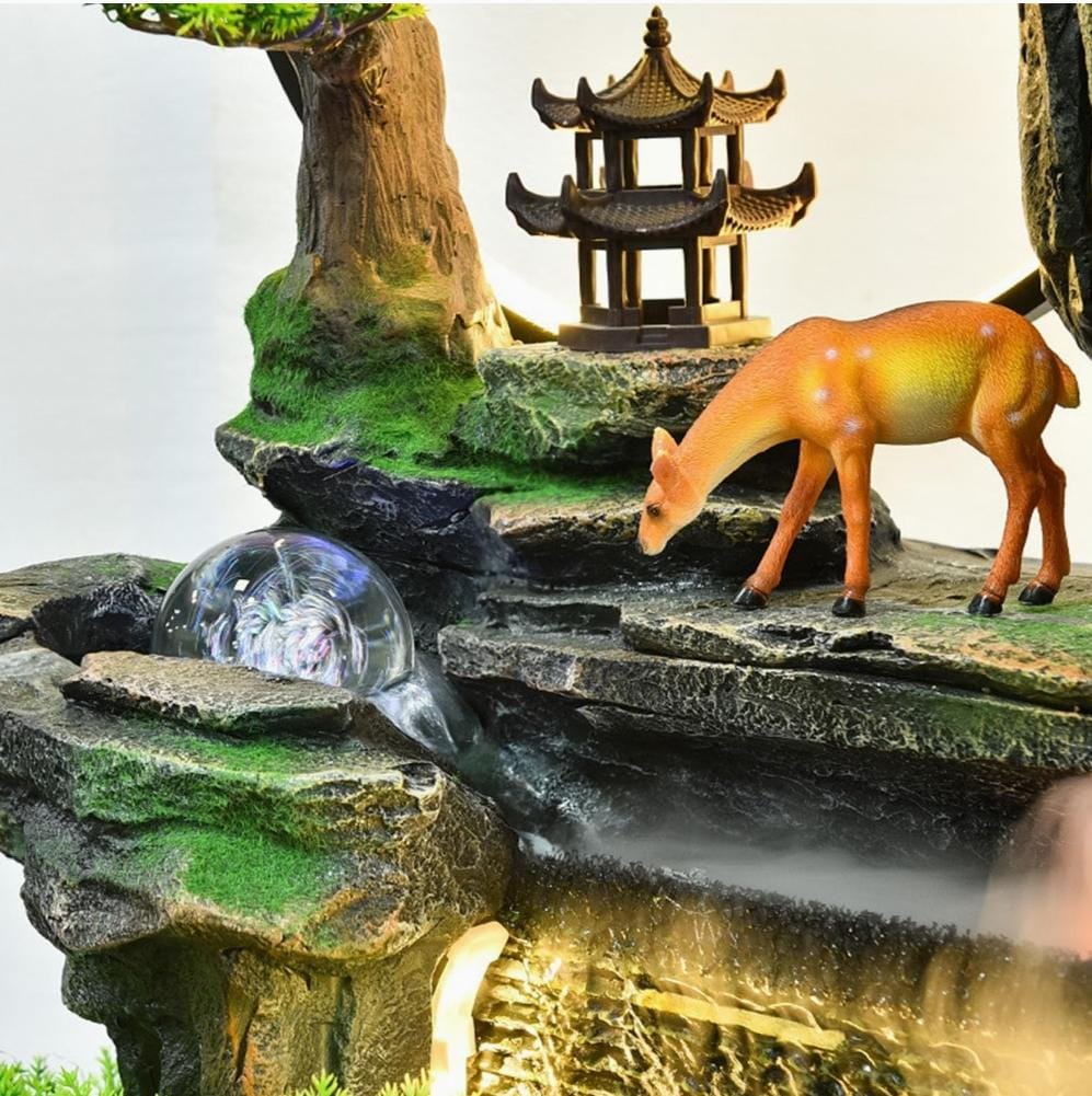 Asian-inspired mountain waterfall with realistic rock formations, decorative bonsai trees, and pagoda elements creating a serene Zen atmosphere