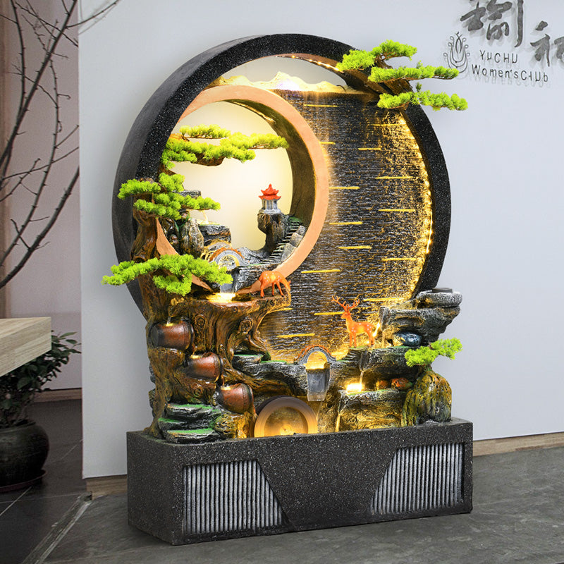 Artistic Circular Design With Flowing Water And Textured Gold Background Adds Modern Zen Aesthetics To Interiors. Features Miniature Deer Figurines, Bonsai Trees, And A Rotating Crystal Ball With Soothing Mist For Natural Charm.