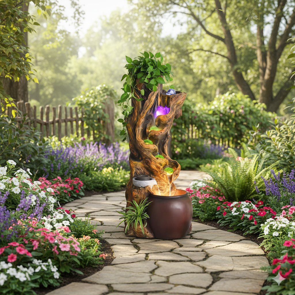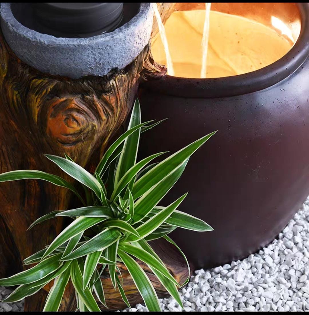 Tabletop water feature combines natural elements with modern lighting, suitable for home or office decoration