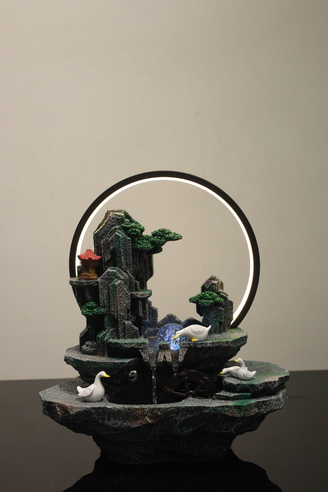 Elegant mountain castle design with illuminated waterfall, creating a serene indoor zen atmosphere with multiple tiers and decorative elements