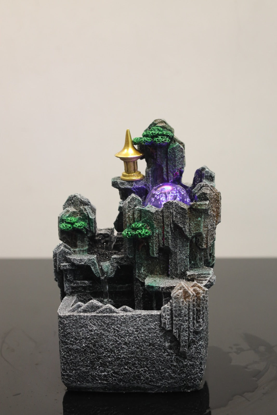 Beautifully crafted tabletop fountain with realistic rock waterfall design, golden pagoda accent, and decorative moss details for an authentic Zen aesthetic