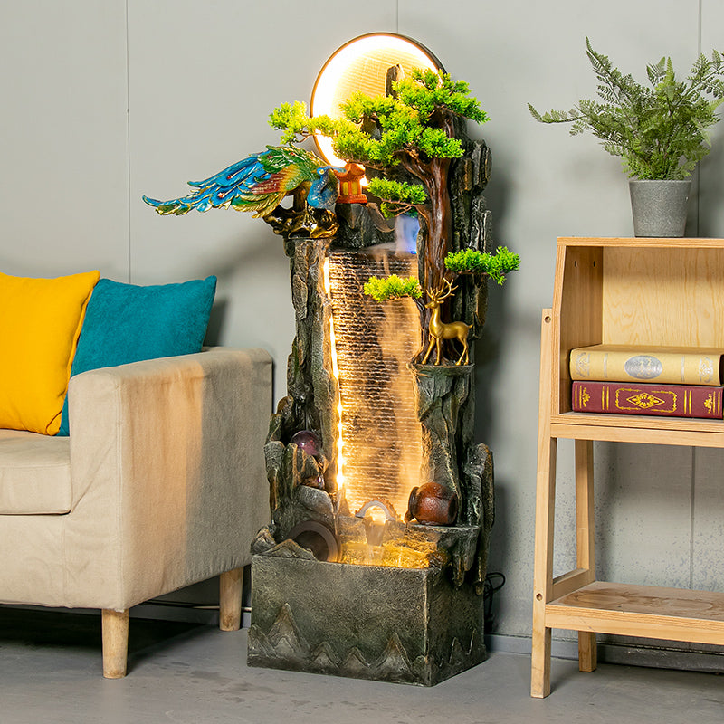 Features Beautifully Sculpted Bonsai Tree, Golden Ring Halo Light, Deer Figurines, And Natural Stone Textures.