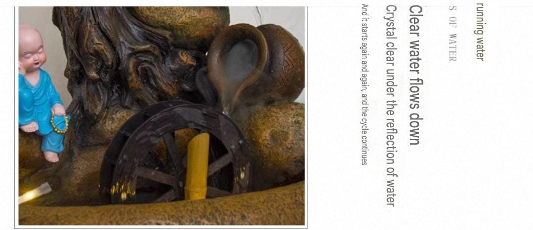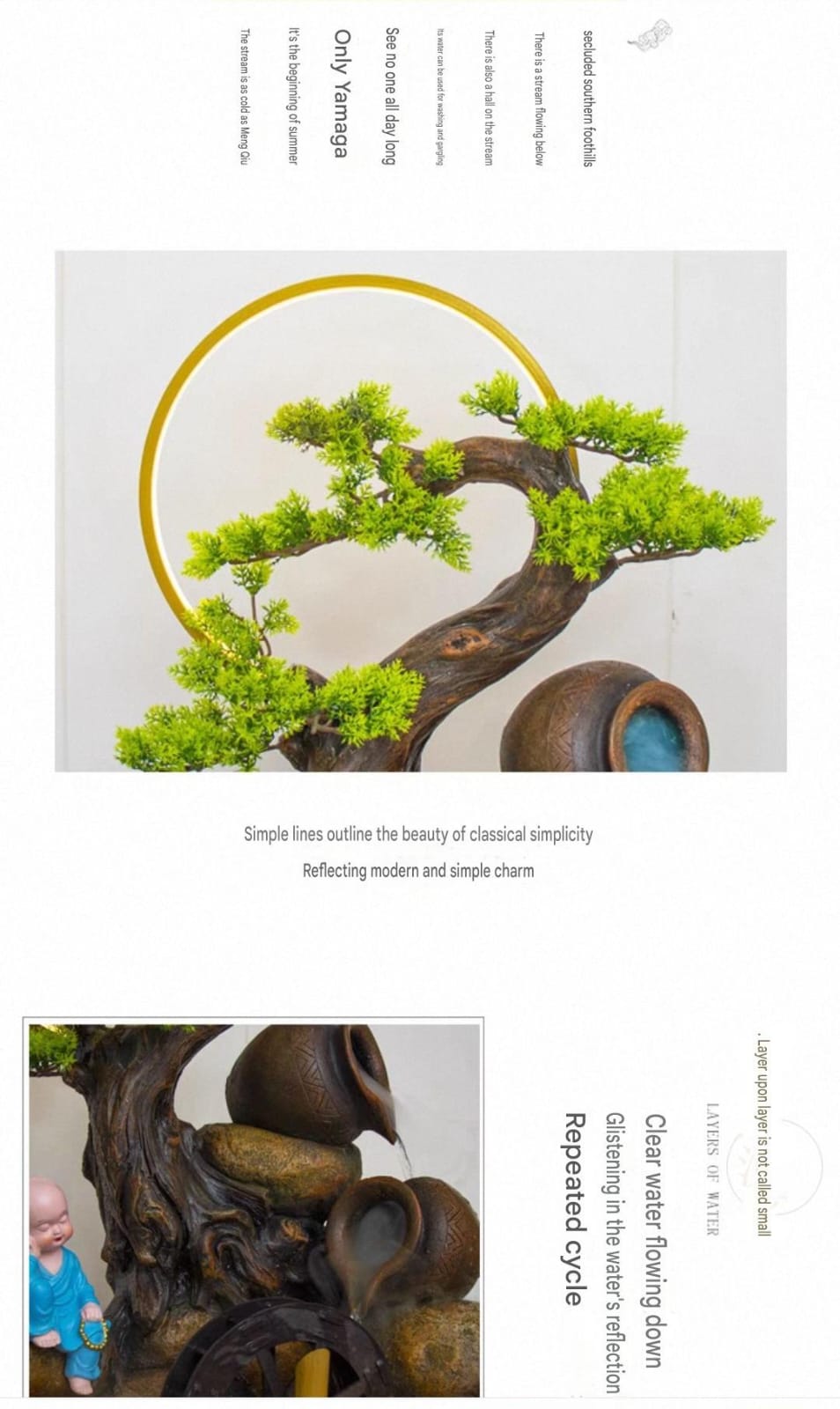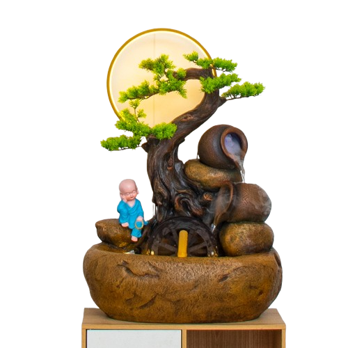 Features a beautifully crafted bonsai tree with cascading water and an illuminated LED moon light creating a serene atmosphere