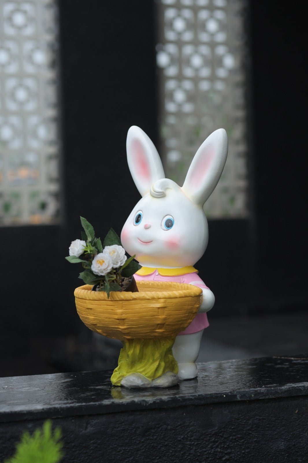 white rabbit wearing a pink dress and carrying a yellow flower basket adorned with red blooms