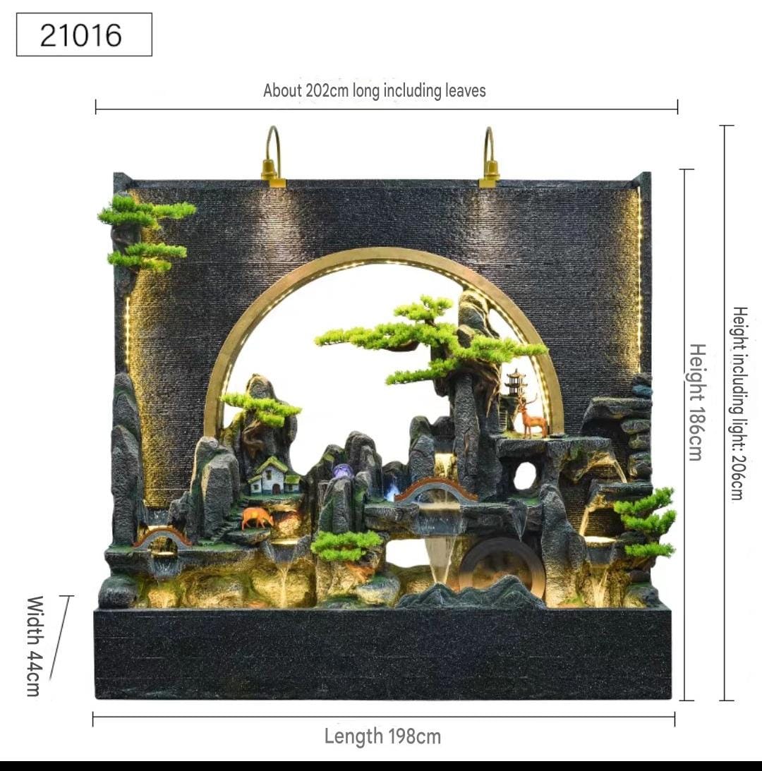 Asian-inspired design featuring rocky mountain terrain, miniature buildings, and decorative bridges for authentic appeal