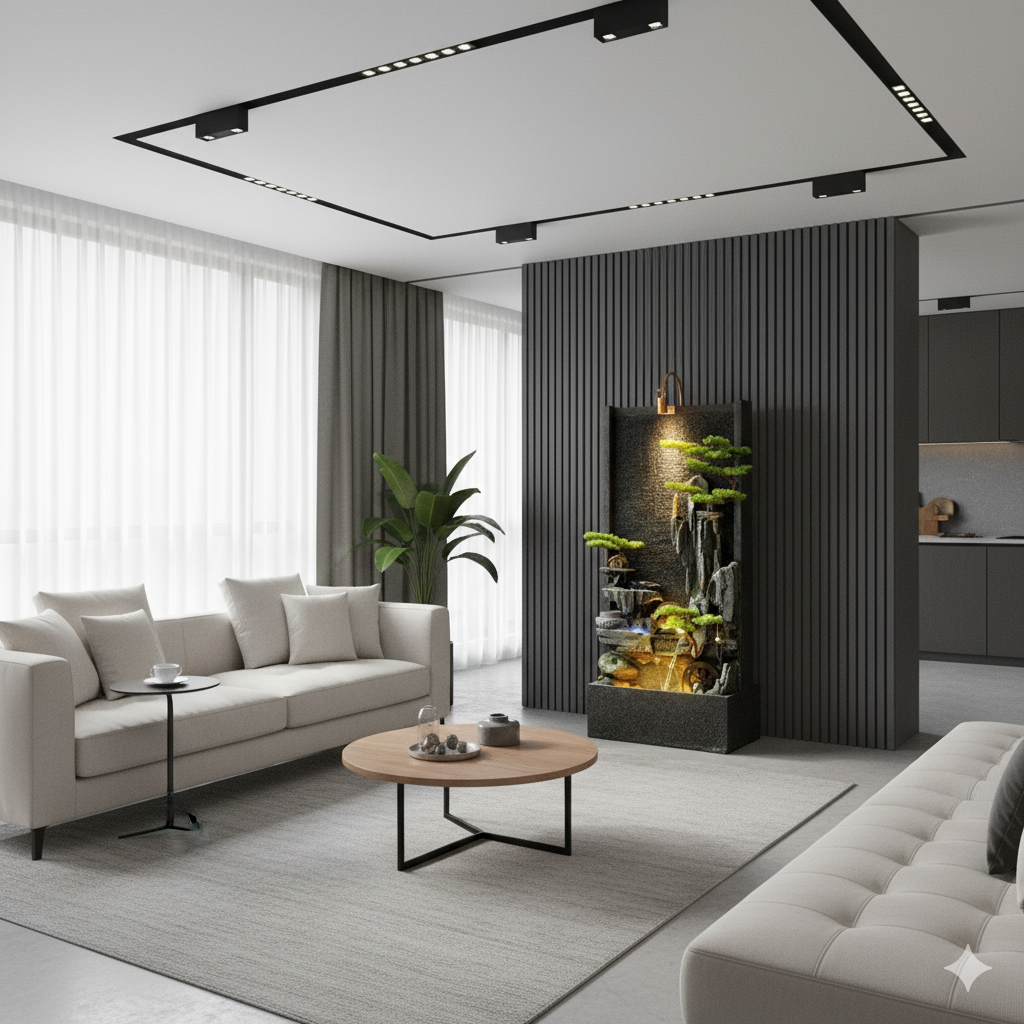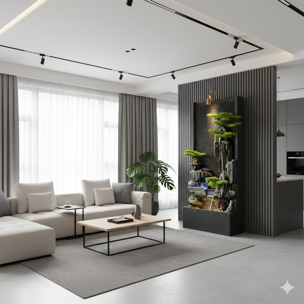 Features cascading waterfall design with artificial bonsai trees and natural-looking rock formations creating a serene Japanese garden aesthetic