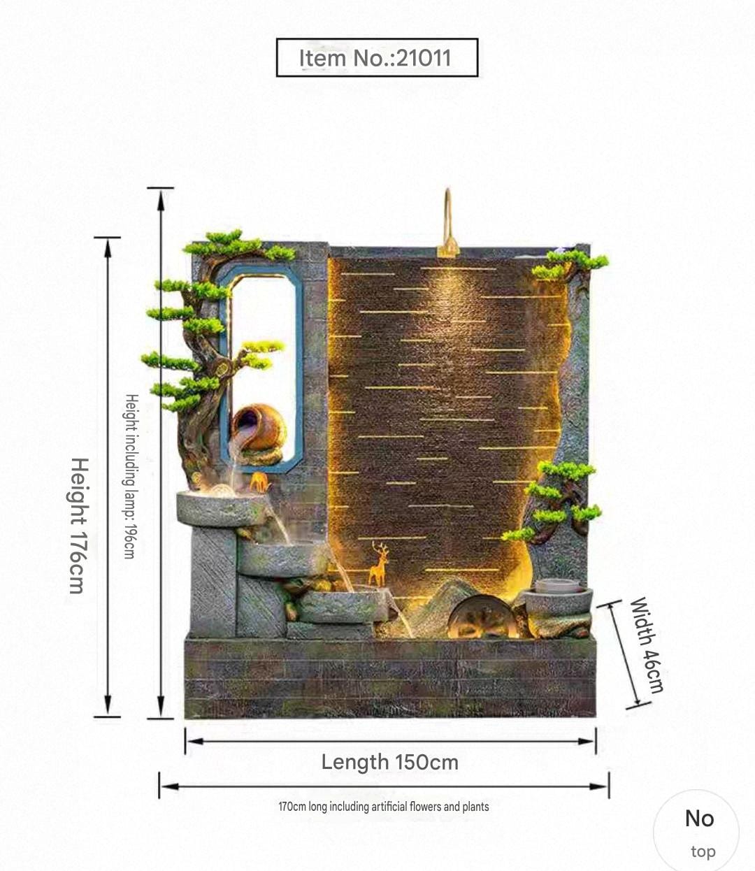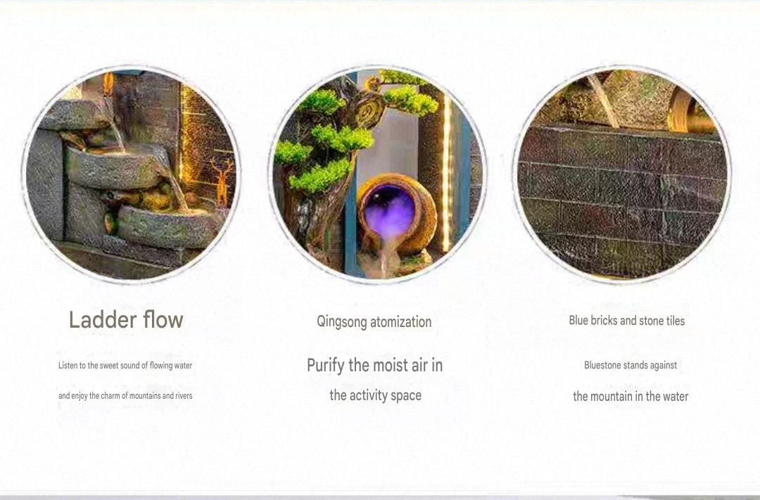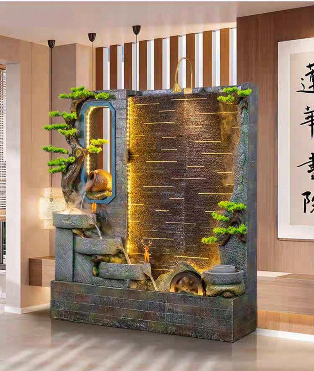 indoor wall waterfall fountain Zen Chinese landscape with led light deer bonsai tree water jar mist water feature.